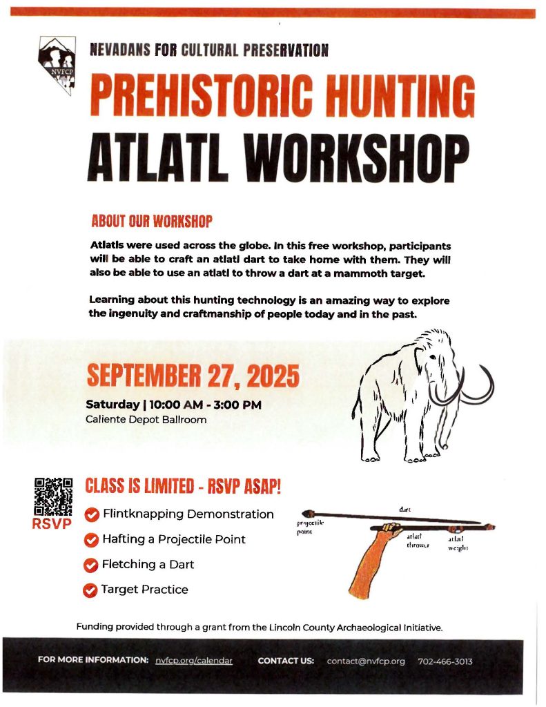 Prehistoric Hunting Atlatl Workshop September 24, 2025 By City of Caliente Nevadans for Cultural Preservation Prehistoric Hunting Atlatl Workshop When: September 27, 2025 10:00am – 3:00pm Where: Caliente Depot Ballroom