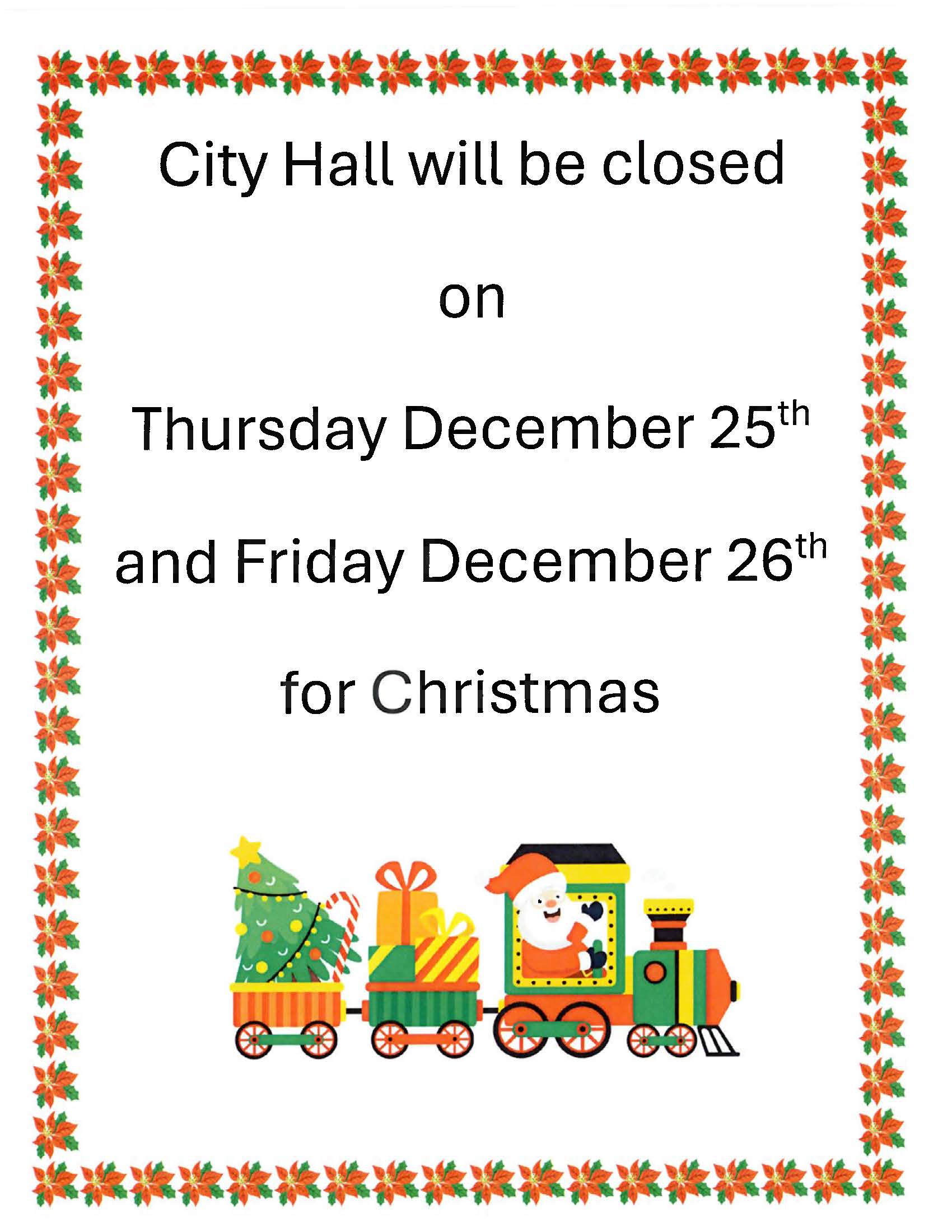 City Hall will be closed in observance of the Christmas Holiday Thursday December 25th and Friday December 26th. In lieu of this holiday, trash service will take place on Wednesday December 24th. Should you have any questions please call Public Works Manager Jared Brackenbury at 775-962-1919. ๐๐ ๐คถ๐ฆ
